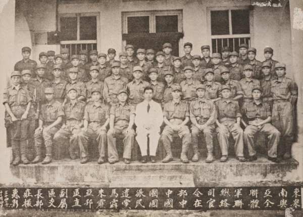 1945年新马光复后,庄惠泉与一三六部队战友在马来亚霹雳州合影,前排正中着白色西装者为庄惠泉(图源:Roots)