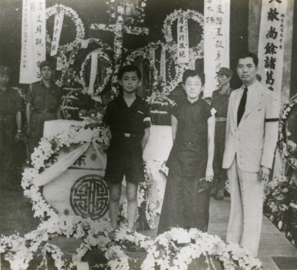 1946年1月13日设于前福安饼干厂内的林谋盛烈士灵堂。右起庄惠泉、林谋盛夫人颜珠娘、长子林良玉(图源:林谋盛家族)
