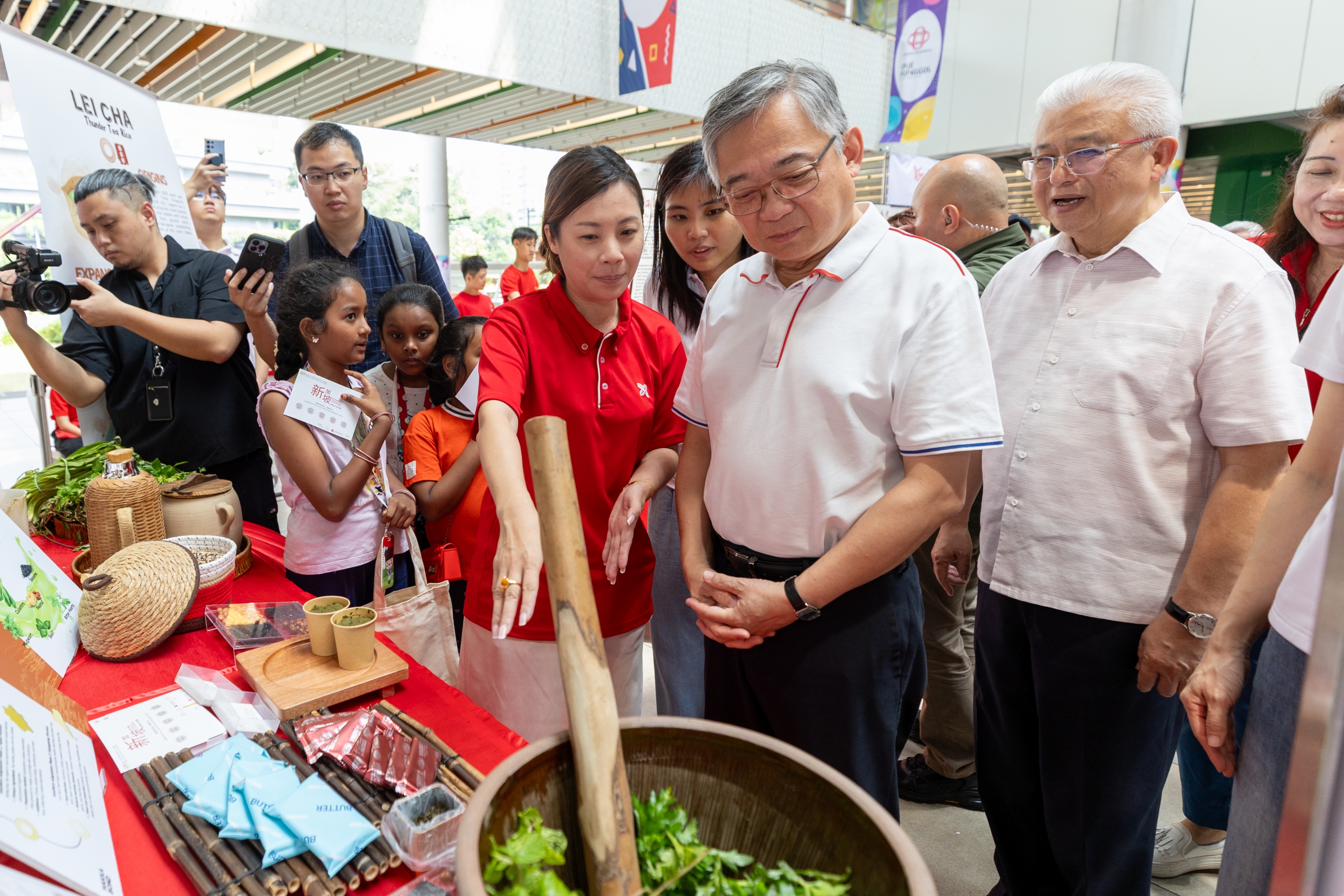 当天下午,活动现场人潮涌动,公众纷纷在广场周围的摊位前参与文化活动,边玩边学,既充实又有趣。现场设置了互动摊位、益智游戏、文物展、华语知识问答、方言绕口令等,让来自不同族群的民众通过多种方式体验宗乡文化之美。宗乡总会属下会馆也在此设摊亮相,南安会馆利用虚拟现实技术把新加坡文化瑰宝——水廊头凤山寺“搬”到现场,完美再现了国家历史古迹之风貌;南洋客属总会则带来了客家擂茶,现场的公众不仅能亲身参与擂茶的制作过程,还能品尝到清爽可口的“擂茶汤”。