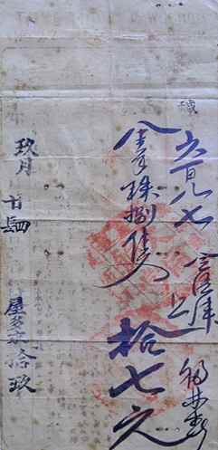 当店、当铺早年的当票。早年包括1970年代流行的当票是直挂式的,当品、银额和当者的名字描述用毛笔蘸墨汁书写,年份日期和当票列号以戳印蘸色墨按盖上去。