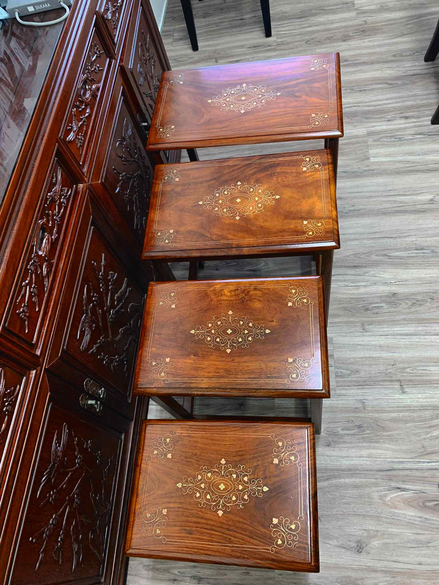 翻新效果不佳的茶几,在源利的修复下,原本黯淡的镶嵌花纹重焕光彩,展现了精致繁复的细节。