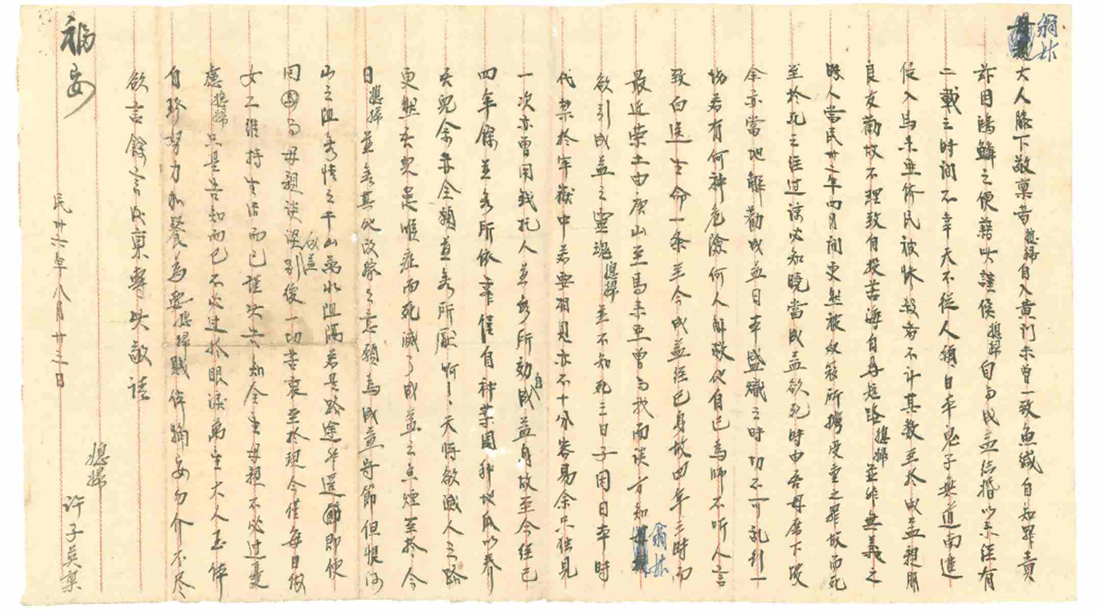 1947年8月23日马来亚许子英寄永春翁姑家书:“夫义胆,妻忠孝”(笔者藏品)