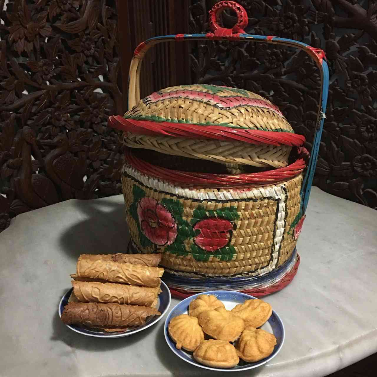 后来,外婆搬离旧房子,搬到政府组屋居住后,简化了过年的准备。年饼不再做了,但她还是会每年做亚喳(Achar)。做年饼和亚喳一般是为了亲友间交换礼物用的,外婆会多做一些来卖。早期峇峇之间会送年饼,除了送外婆做的鸡蛋卷和亚喳,还有绿豆糕、花生饼、年糕等,会用金漆黑底的谢篮装这些礼品。当邻居送来一些肉干和柑,外婆就会想要“balas balek”些什么,有时是一罐外婆做的亚喳,有时是姨婆送的花生饼,但也有时候,外婆会在一个袋子里面放一盒饼干或几粒柑,再加上一个十二块钱的红包代表祝福。土生华人不习惯在过年时带一对柑去拜年,而是在过年前送柑和年饼。随着土生华人和“新客华人”的交流增加,土生华人也接纳了带柑去拜年的习俗。土生华人的年前准备活动在冬至后开始,在除夕夜落幕。我们赶着在正月初一子时前换窗帘、床单等,做好新年前的最后一场清洁活动,准备迎接农历新年的到来。