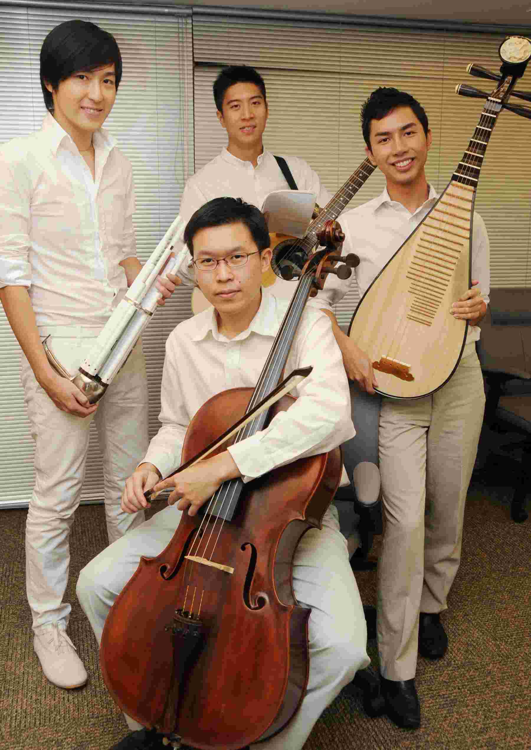 林亿(后排中)和几位志同道合的音乐好友在2005年创立了“鼟—室内民族乐团”(www.thetengcompany.com)。初衷不过是出版一本乐器教材,没想到四年后,“鼟”却成了他们全心投入的事业。