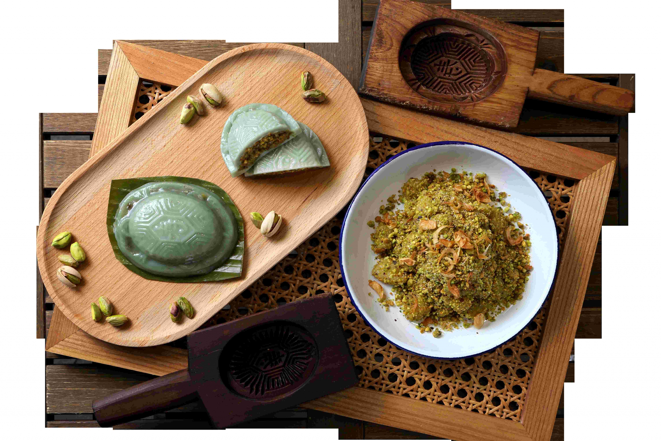 传统糕点店“阿嬷传承”(Ah Mah’s Legacy),以自创的开心果麻糍和红龟粿打响名堂。开心果红龟粿的粿皮以日本番薯制成,混合蝶豆花形成好看的翠玉色。整颗开心果磨成粒,加入南瓜籽牛油增添顺滑口感,以及些许海盐提味解腻。