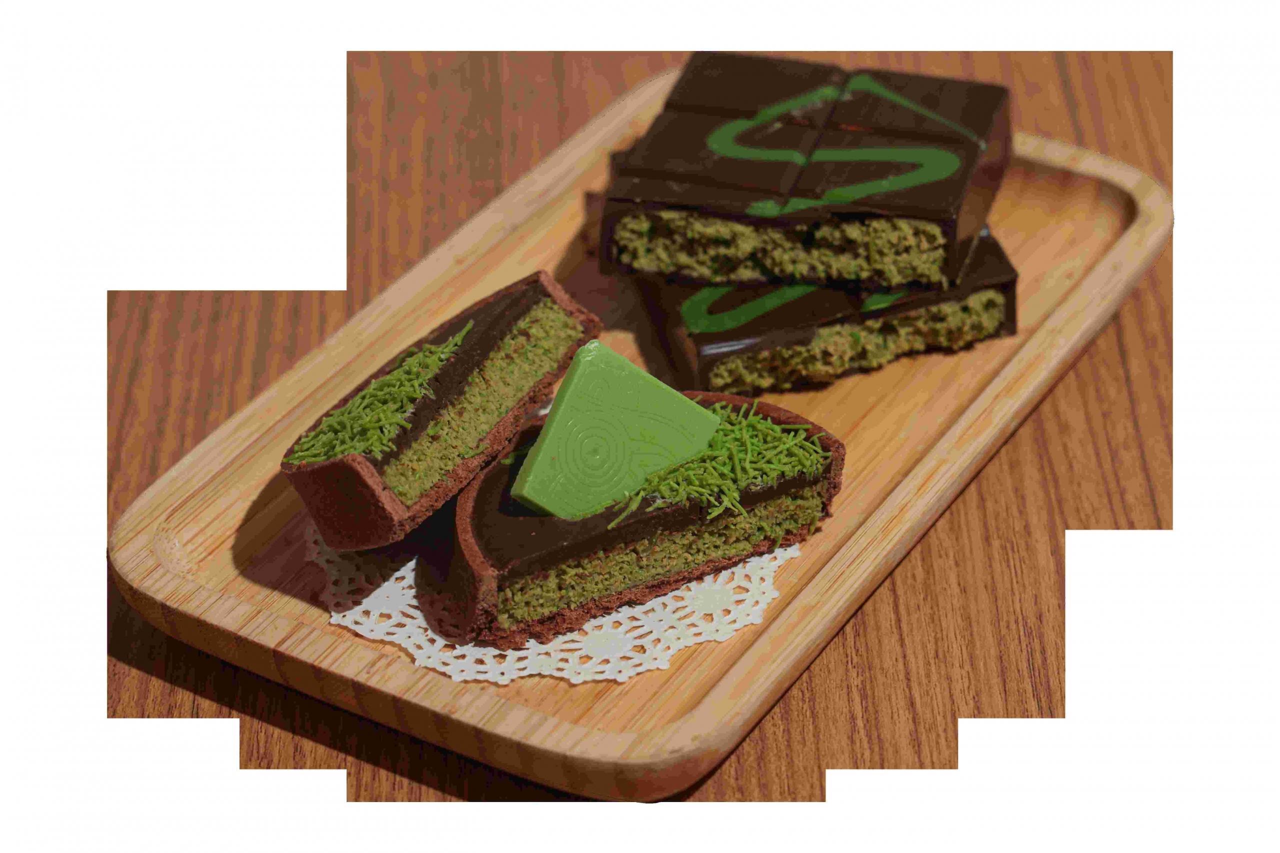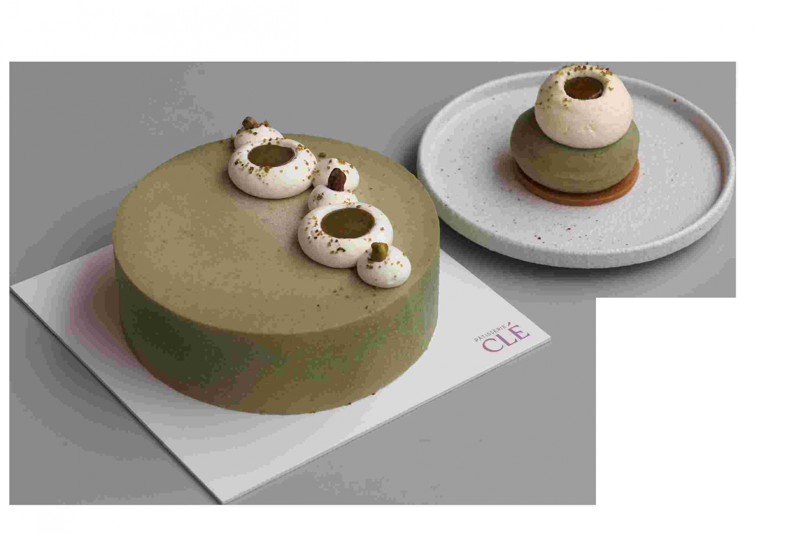 Pâtisserie CLÉ的两位创始人在2016年于法国研修烘焙时,便注意到开心果是法式与意式甜品中备受青睐的风味。2023年,他们推出了一款全开心果蛋糕,严选纯正的意大利烤开心果,融合了开心果海绵蛋糕、杏仁脆片、甘那许(ganache)及慕斯等多重层次。