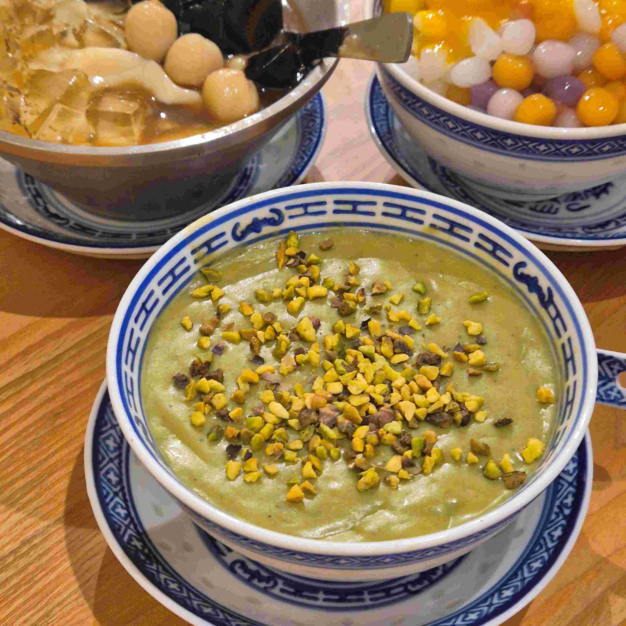 除了甜心点点,本地许多中式甜品店都有推出开心果糊。西式咖啡馆和新式茶饮店,也陆续将开心果作为创意点子。
