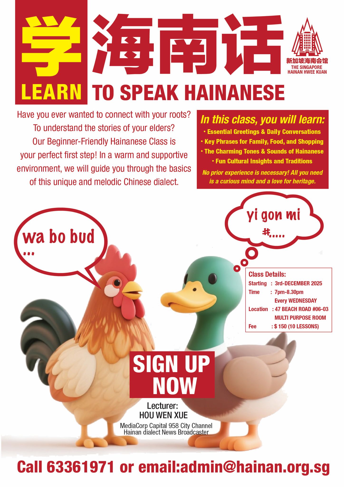 Hainan Huay Kuan will be organising a series of Hainanese Language lessons! If you would like to better converse with your elders, hear their stories and thoughts, come sign up today!