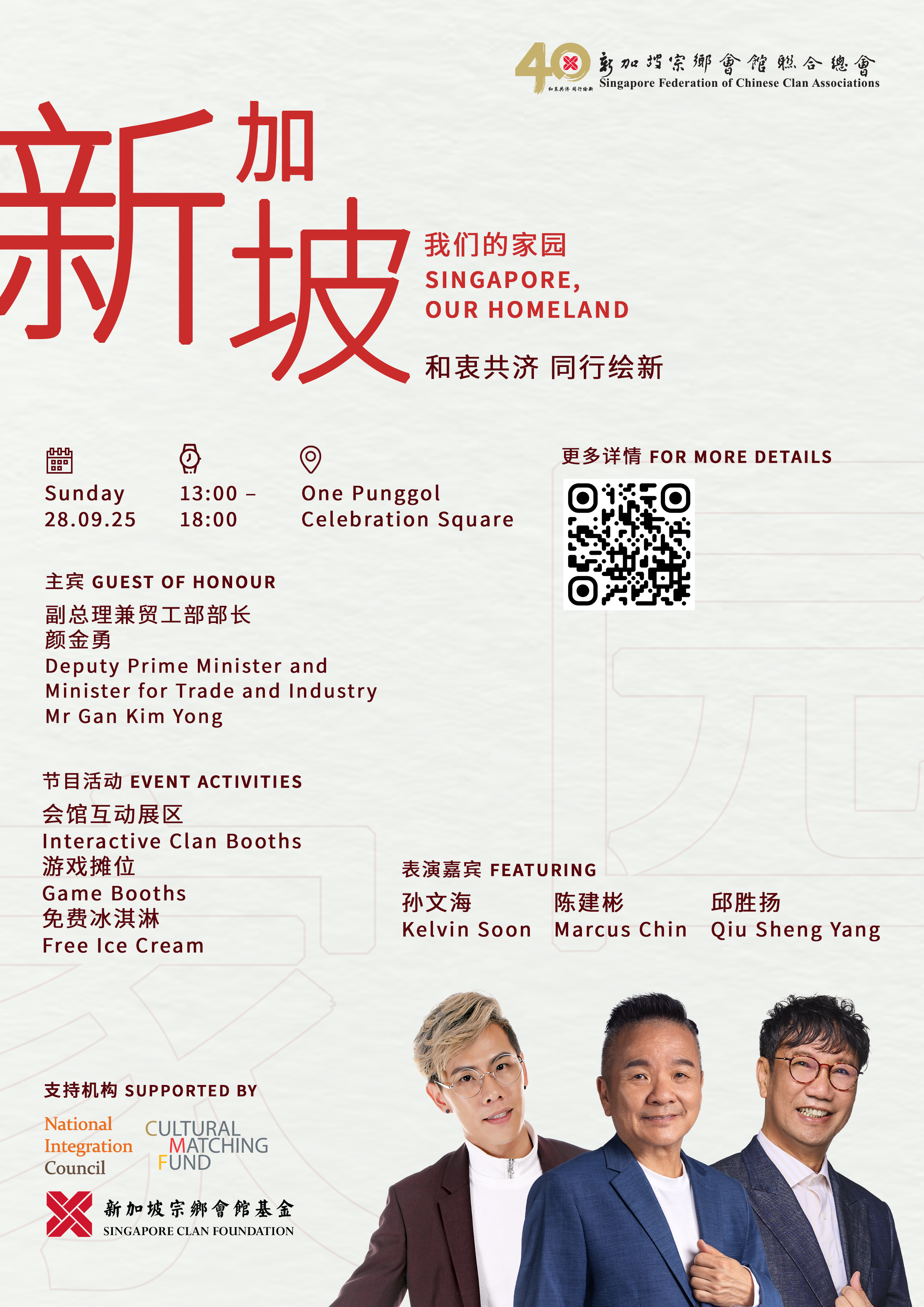 11 月 2025 11 月 03 2025 - 12 月 22 2025 【海南陈氏公会】海南俚语歌谣会话班 Uncategorized 11 月 29 2025 - 12 月 20 2025 【新加坡海南会馆】《持久授权书讲座》 Uncategorized 12 月 2025 12 月 03 2025 - 2 月 04 2026 【新加坡海南会馆】《学海南话》课程 Uncategorized 12 月 21 2025 【钟氏公会】双诞Lunch 2025 Uncategorized 12 月 31 2025 【同安会馆】音乐与舞蹈兴趣小组 Uncategorized No event found! 中文 EN 中文 EN Search for: Date 2025.09.28 Expired! Time 1:00 pm 新加坡:我们的家园2025 周末亲子好去处! 还没决定带家人去哪玩吗?别错过宗乡总会即将举办的“新加坡,我们的家园”活动,和家人共同来了解本地会馆文化! 活动亮点: 免费冰淇淋,人人有份! 精彩演出 会馆互动展区、游戏摊位,及丰厚奖品 记得把时间空出来,一起加入我们,探索我们的家园! 📅 日期:28.09.2025(星期天) 🕑 时间:1pm – 6pm 📍 地点:One Punggol Celebration Square 欲知更多详情请扫QR码——座位先到先得! Share this event + Add to Google Calendar + iCal / Outlook export