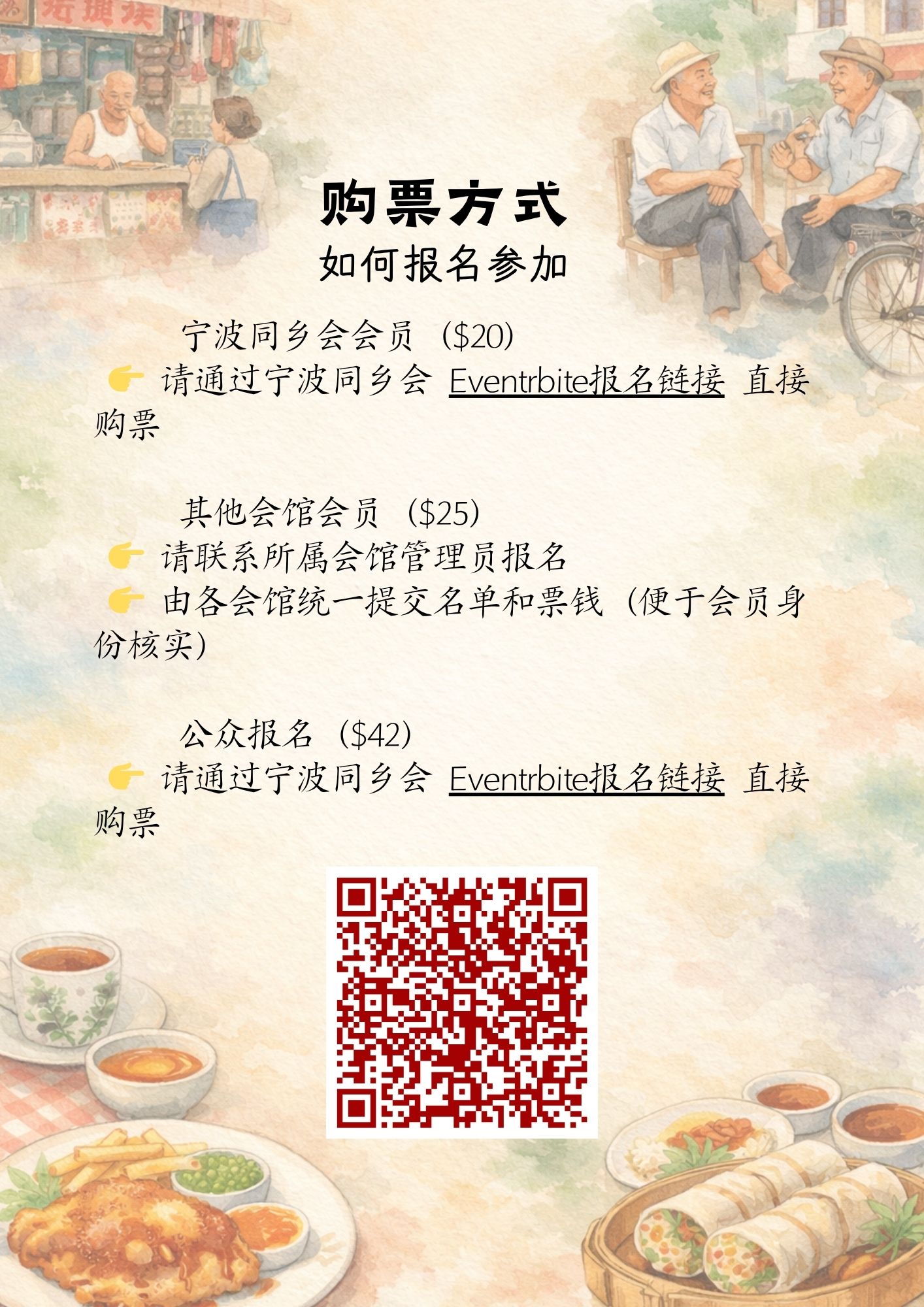 票价:宁泼同乡会员 $20 / 其他会馆会员$25 / 公众 $42